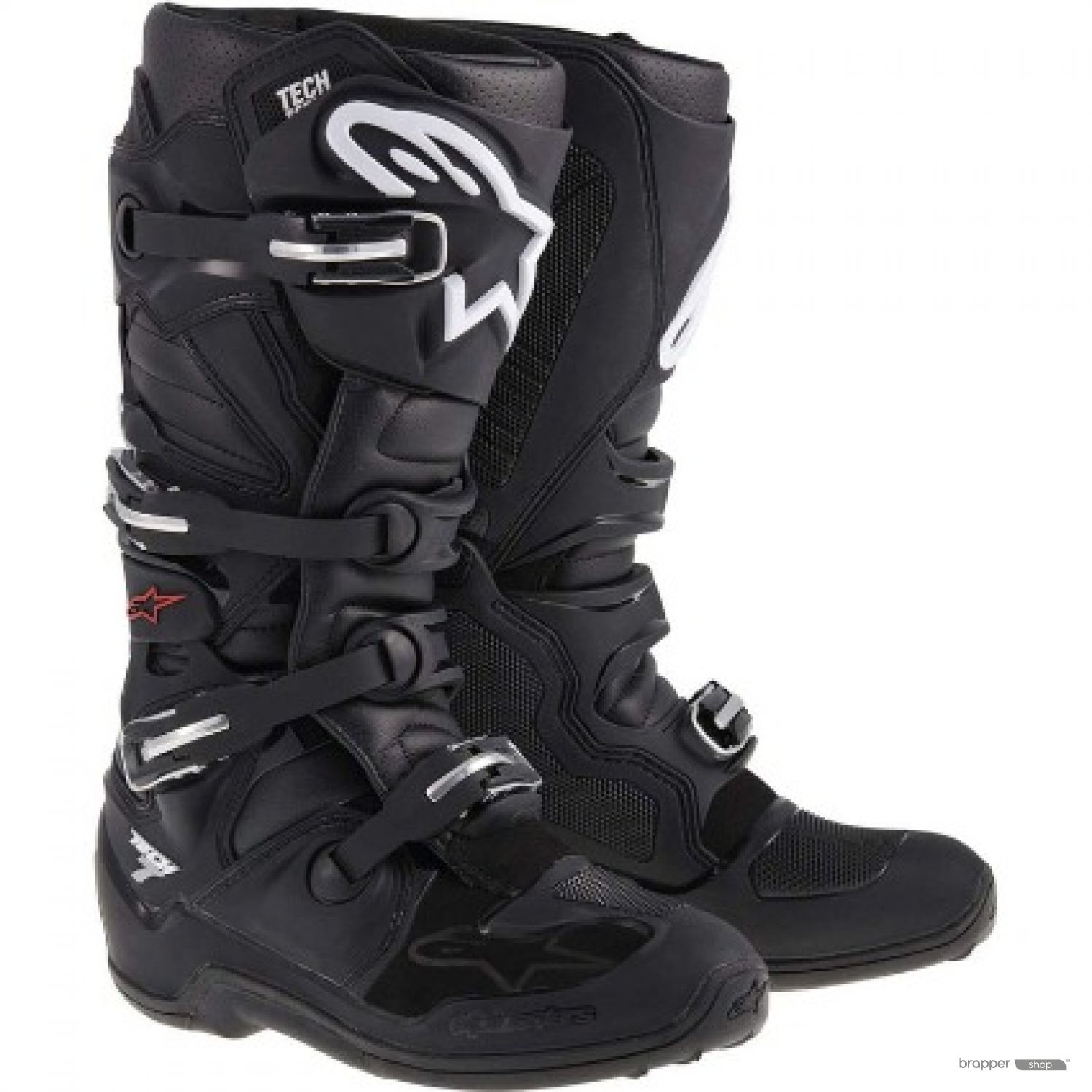 The Alpinestars Tech-7 Boots feature an upper constructed from light, innovative microfiber that is flexible and abrasion resistant. Innovative, evolutionary TPU shin-plate construction for greater range of fitment features a reinforced VELCRO® brand closure for comfortable, highly customized closure. The shin zone incorporates a TPU blade system engineered to prevent frontal hyperextension and offer greater flex control. Wide entry aperture for convenience with VELCRO® brand upper closure TPR flap to allow broad ranging calf fit adjustment and support. Medial-facing area is constructed from one-piece TPU panel with honeycomb sculpturing for maximum grip contact with bike and improved heat and abrasion resistance. Top rear flexion of the boot is supported around the calf by an innovative TPU sliding blade system which dissipates the friction.