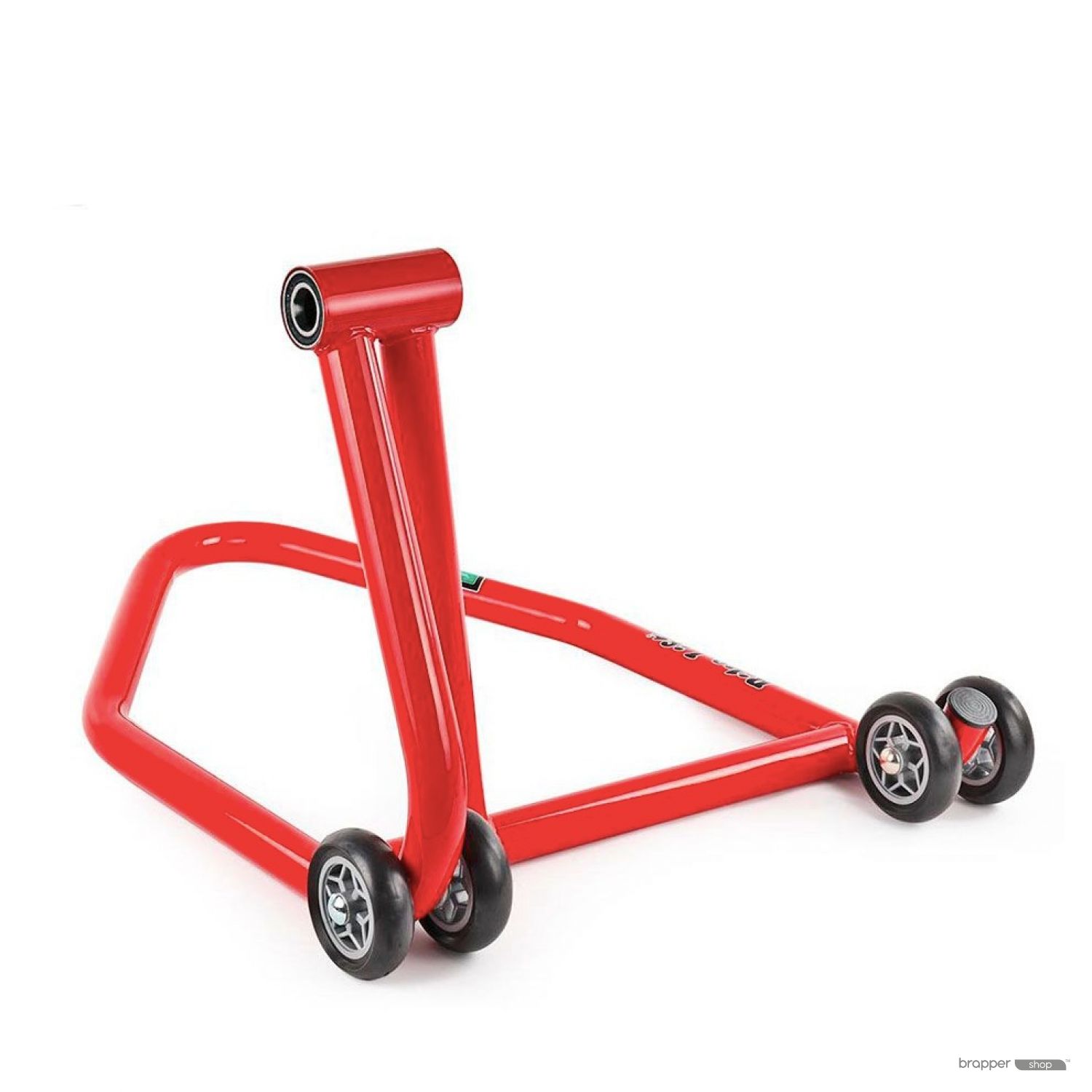Rear stand for double-sided motorcycles, made with 35 mm diameter tube and 2mm thickness, completely painted with polyester powder. Equipped with 4 nylon wheels with soft rubber tire, diameter 90 mm. The pin holder bush houses two ball bearings which allow the rotation of the lifting pin.