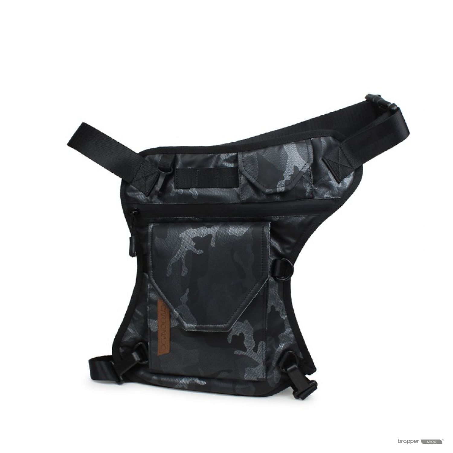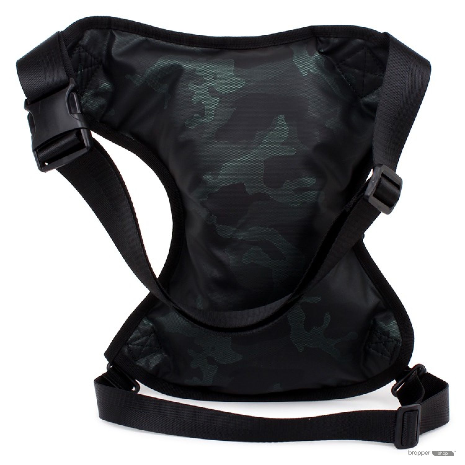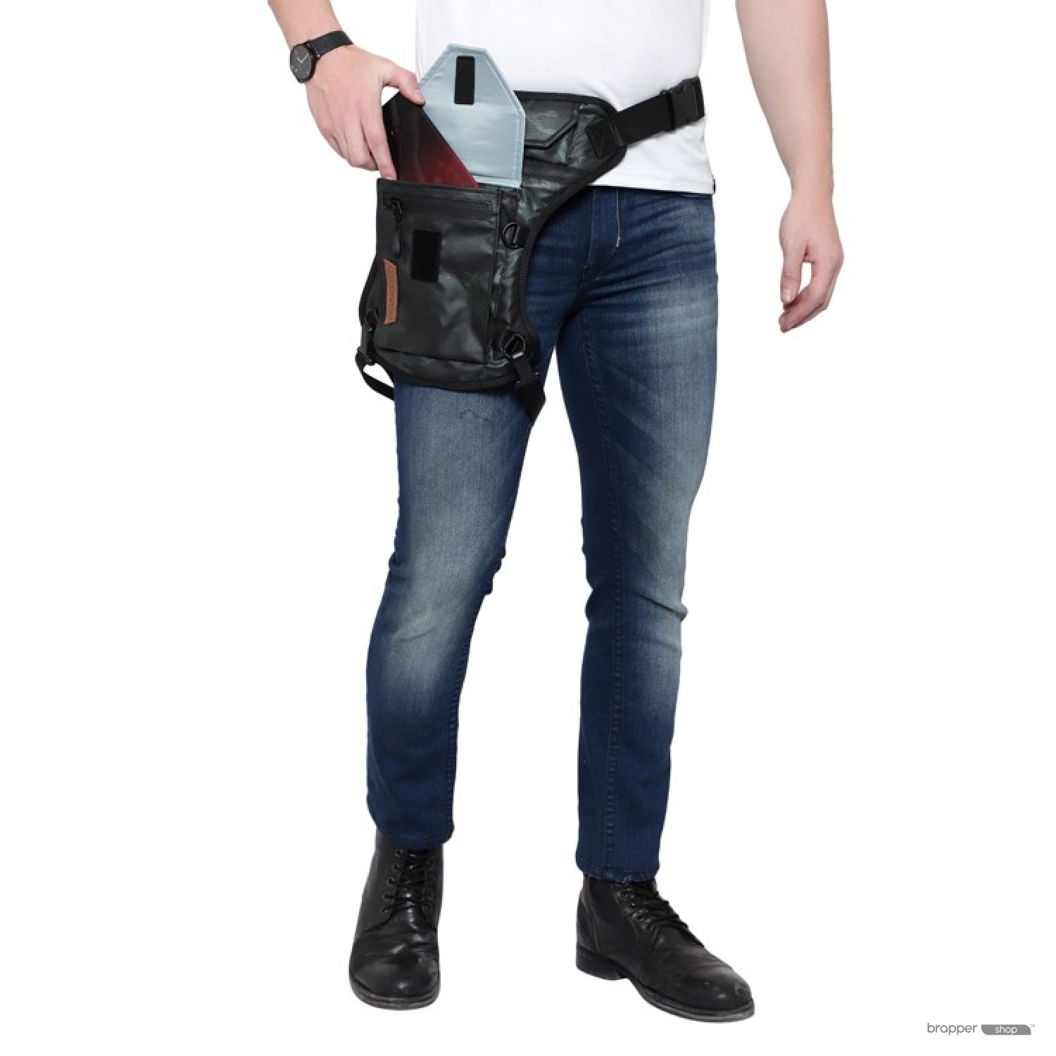 - Just take the larger waist strap and run it across your preferred shoulder and buckle it in. The thigh strap can be removed. We promise that you’ll look just as cool as you would with it around your waist!