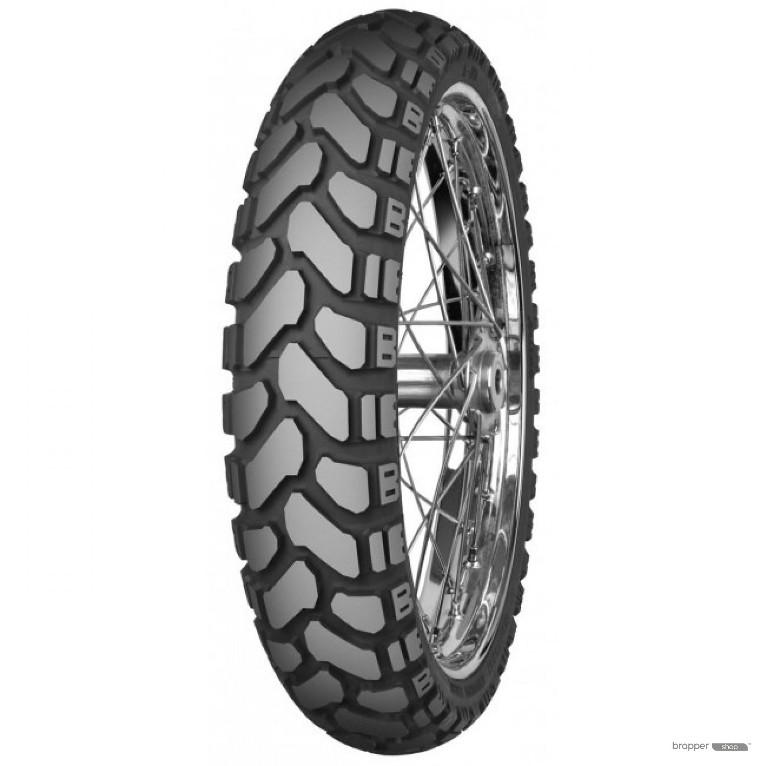 Standing on the shoulders of the extremely popular E-07 is the E-07+, a version specifically designed for the largest of trail-going motorcycles. With cross-ply construction and a slightly modified big-block chevron tread pattern, the E-07+ provides excellent grip on both pavement and the roughest terrain. The big-block design of the E-07+ not only provides extra stability on pavement but also pulls double duty when the going gets tough by quickly evacuating mud, water and sand that can become lodged in smaller tread blocks.