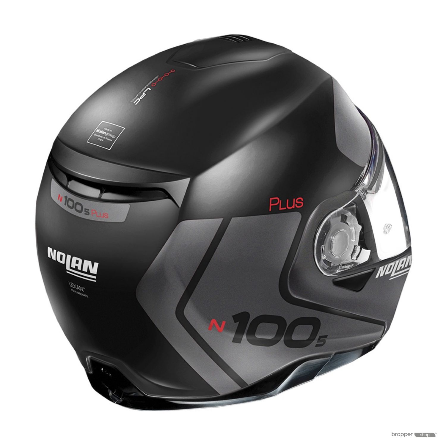 The latest and most exclusive version of Nolan’s top-of-the-range flip up helmet, here enhanced with Clima Comfort inner padding with its innovative net construction and adjustment system for the position of the liner (LPC - Liner Positioning Control). The new technical content is accompanied by a sporty and elegant look and a complete style overhaul of the inner comfort padding. The consolidated technical features that make the N100-5 a highly appreciated product among the most demanding of motorbike tourists are all present: compact size (thanks to the availability of two outer shell sizes), double P/J homologation, ultrawide visor, VPS sunscreen (adjustable in various positions and fitted with the automatic retraction system), AirBooster Technology upper ventilation system, rotation of the chin guard with elliptical rotation, exclusive double-action chin guard opening mechanism, double lever Microlock2 retention system with micrometric adjustment, Clima Comfort inner padding (with micro-perforated fabrics and adjustable neck- roll) and set up for the N-Com communication system.