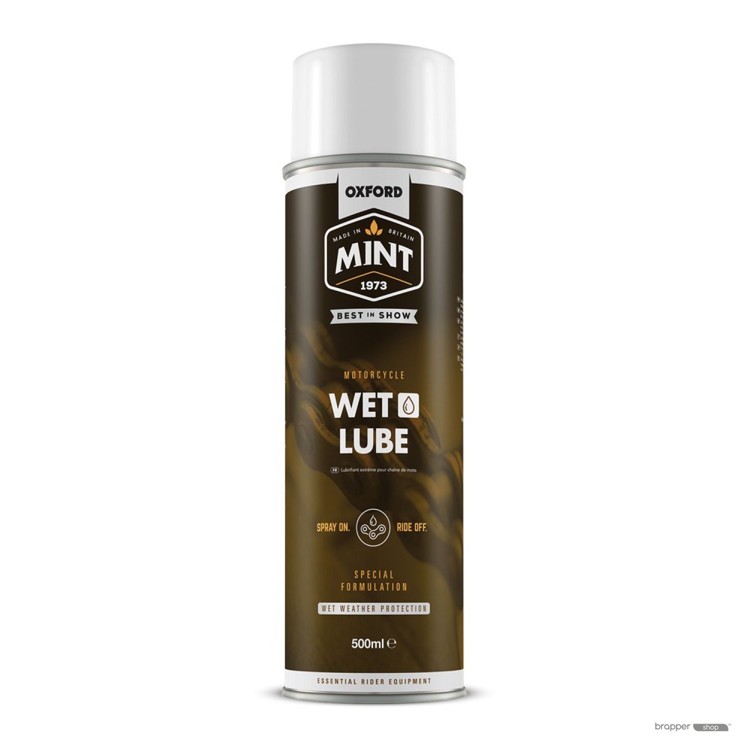 Mint Wet Weather Lube is specially formulated with a high anti-corrosion content and a film-forming wax with a resin binder. All of this improves durability and performance in very wet conditions. There is also PTFE present in the formulation which fills the gaps between moving parts to reduce dirt ingress.