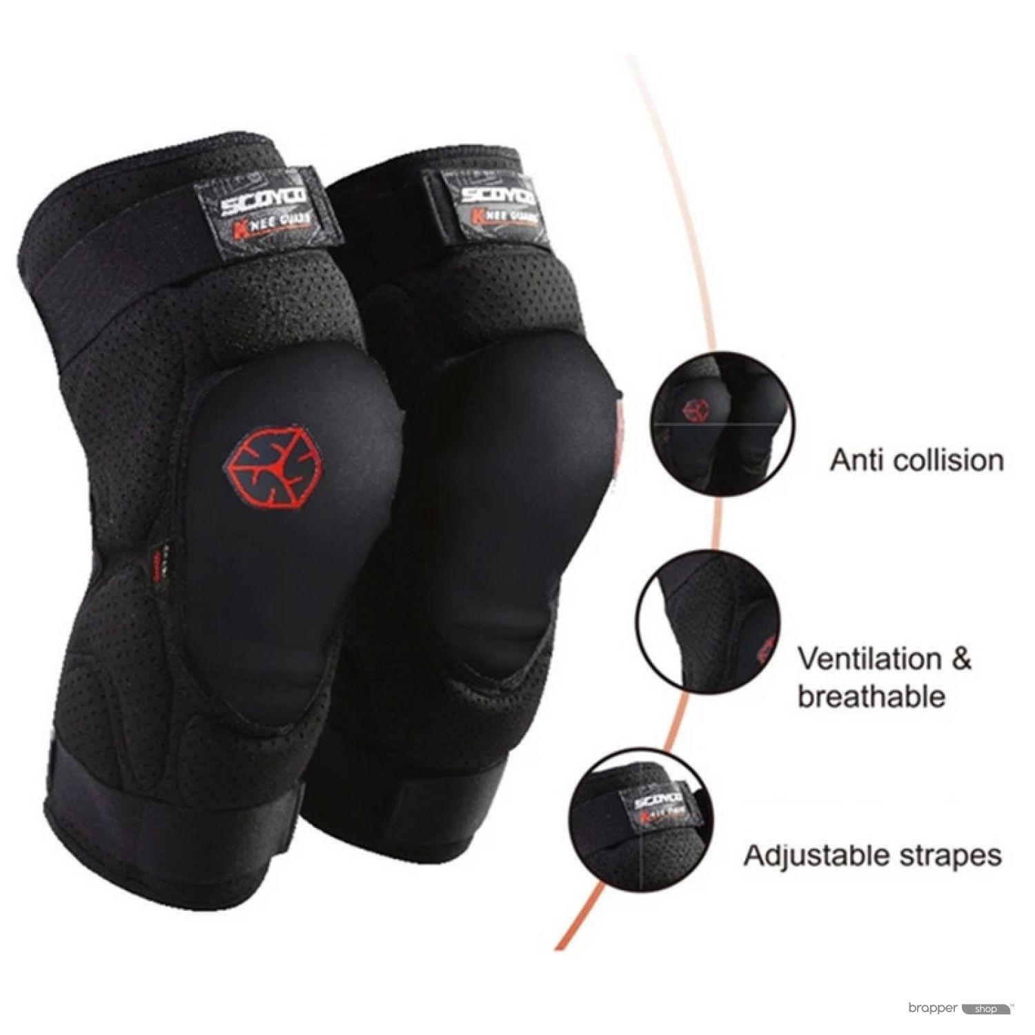PP protector conforms to human ergonomic,shock-resistant, and anticollision Durable fabric on the knee area, wear-resistant Adjustable velcro Lateral use quality cotton pads, pressure-resistant Perforated Neoprene design for more ventilation and comfort.